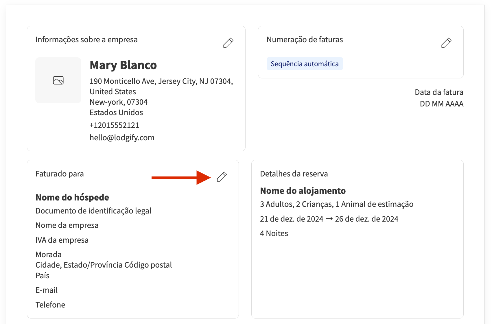 Pode editar uma fatura para atualizar as informações da sua empresa, as informações do hóspede que aparecem nessa fatura específica e adicionar notas.