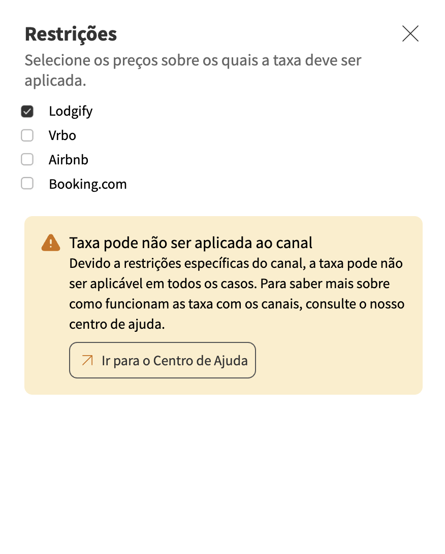 Se os seus alojamentos estiverem conectados à Airbnb, Vrbo e/ou Booking.com e estiver a criar um imposto no Lodgify (como a taxa Short Stay Victoria Levy), certifique-se de remover as OTAs das restrições do imposto para evitar cobranças duplicadas.