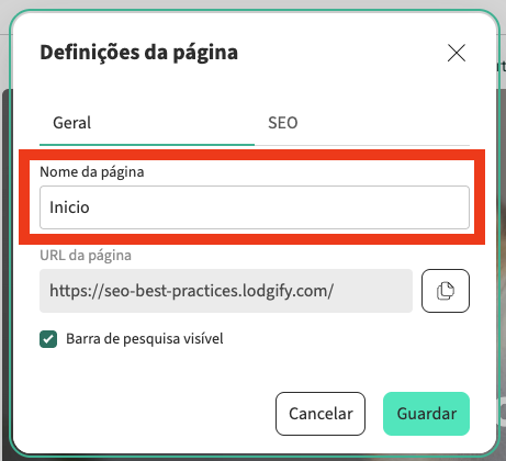 Na janela destacada, ajuste o título da página no campo Nome da página.