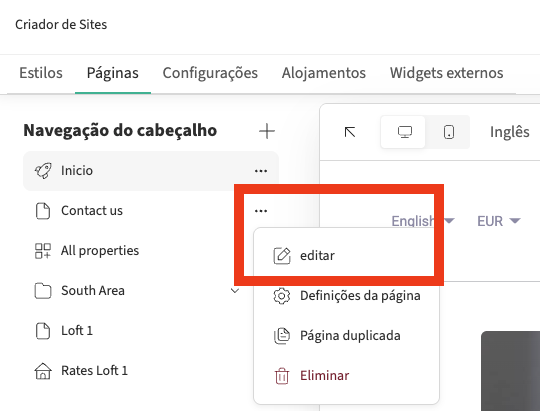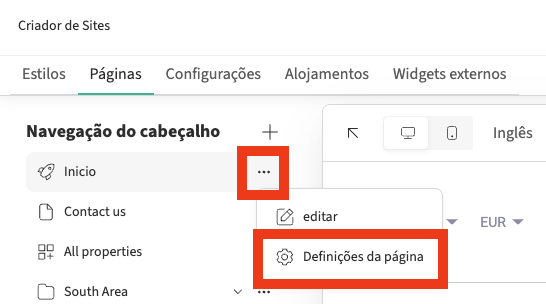 Pode alterar os títulos das páginas na secção Páginas do seu criador de sites. Clique nos três pontos ao lado da página e selecione Definições da página.