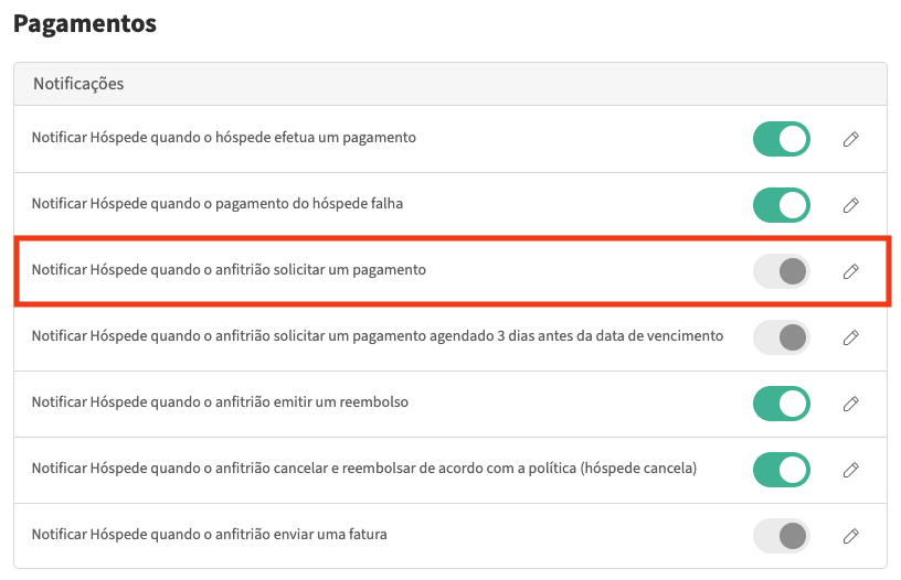 💡 Nota: Pode editar/rever o conteúdo da notificação de pedido de pagamento na secção de Respostas automáticas da sua conta. Clique no ícone do lápis ao lado da notificação "Notificar Hóspede quando o anfitrião solicitar um pagamento":