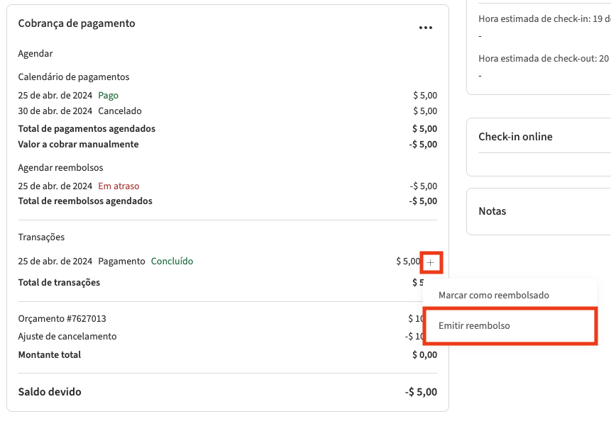 Se o hóspede pagou através de PayPal ou métodos de pagamento manuais, terá de processar o reembolso externamente.