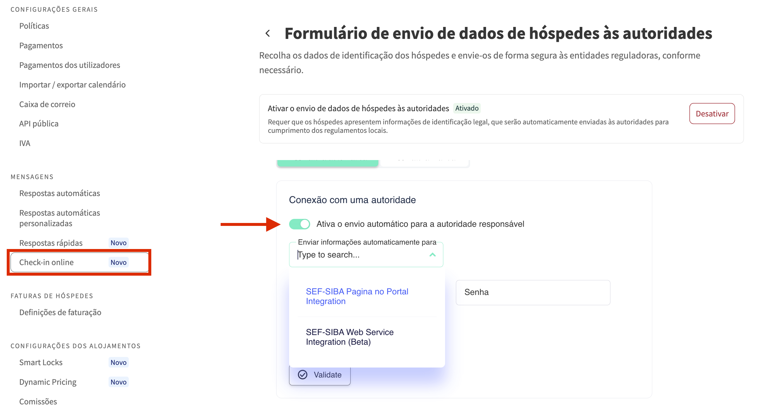 Se anteriormente utilizava o método antigo (SEF - SIBA no Portal), inicie sessão na sua conta SEF, altere o Método de envio para Web Service e, de seguida, vá à Lodgify e selecione SEF - Integração Web Service SIBA.