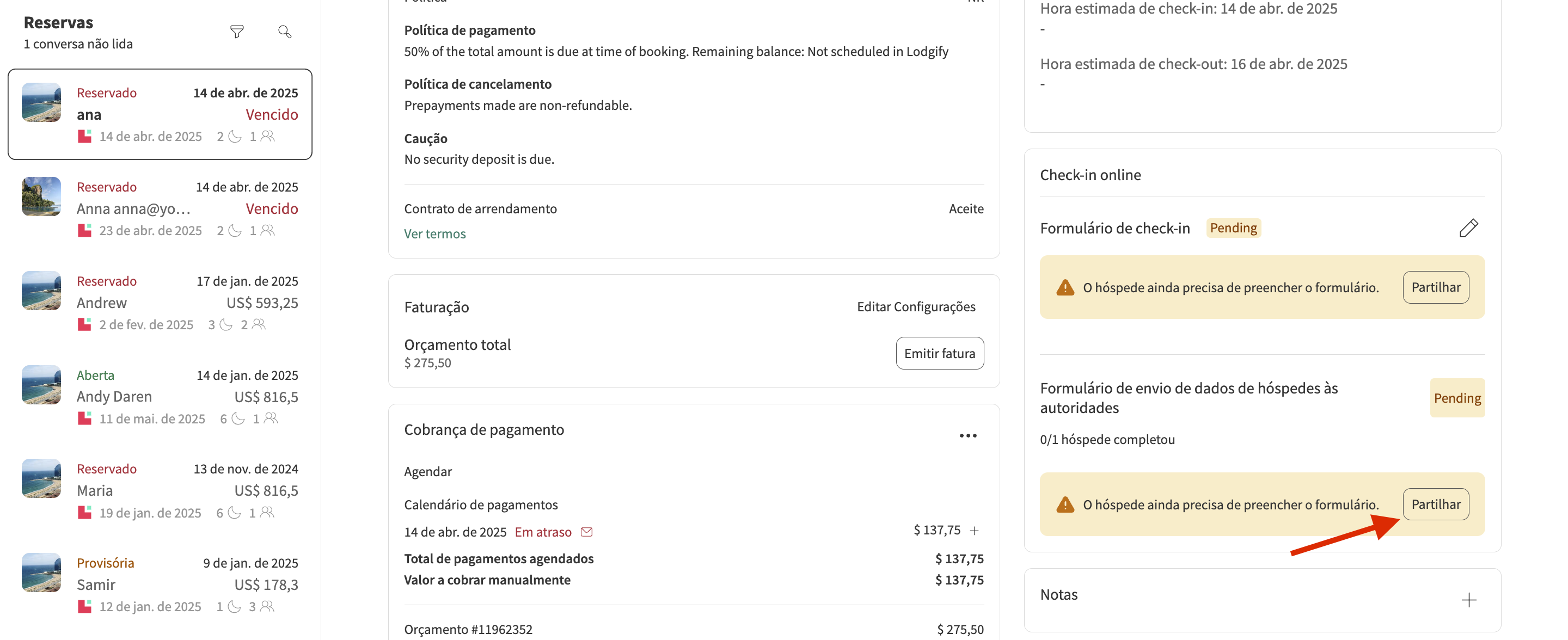 💡 Nota: Os dados dos hóspedes são enviados automaticamente às autoridades no dia do check-in, por volta das 19:00 UTC. Se os hóspedes se registarem após esse horário, será necessário enviar os dados manualmente a partir da reserva.