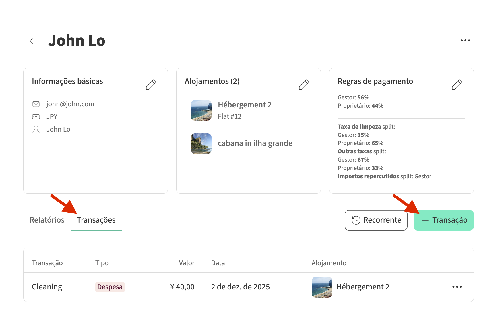 Clique no proprietário para o qual deseja criar uma nova transação, depois selecione Transações e + Transação.