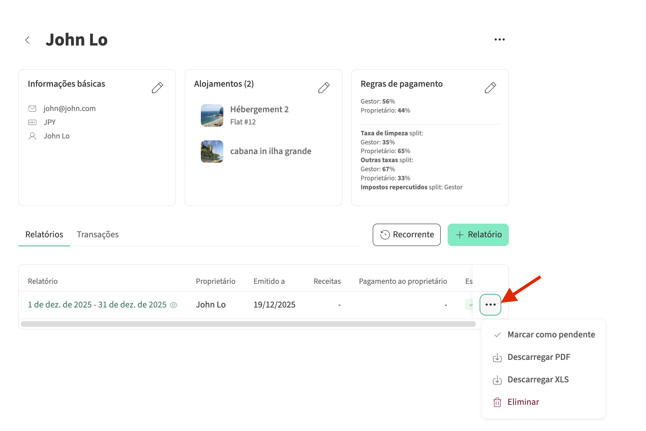 - Clique no proprietário associado, depois selecione os três pontos à direita do relatório que deseja marcar como pago e clique em Marcar como pago.