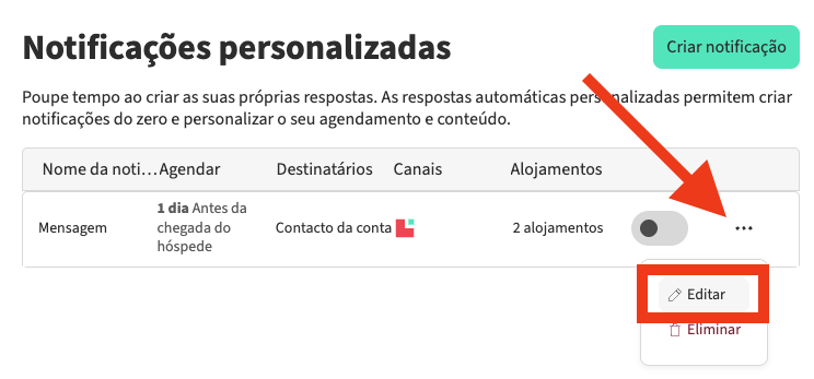 - Localize a notificação personalizada que deseja editar, clique nos três pontos à direita e depois em Editar.