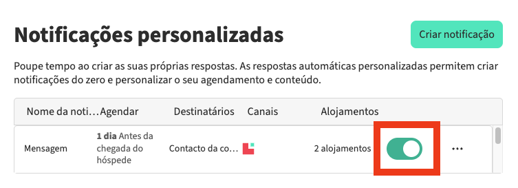 As notificações personalizadas criadas recentemente estão ativadas por padrão (= ligadas). Se não quiser que uma notificação personalizada seja enviada, pode desativá-la movendo a alavanca para a esquerda. Pode sempre ativar a notificação personalizada novamente movendo a alavanca para a direita.