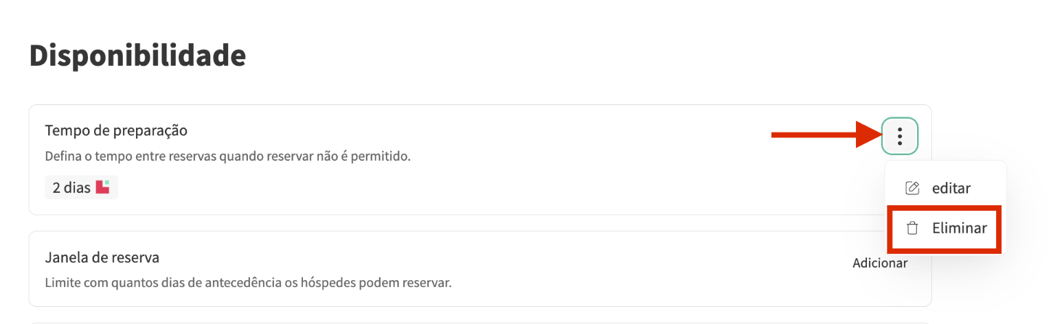 Se desejar bloquear automaticamente um ou dois dias antes e após cada check-in/out, clique para configurar o seu tempo de preparação. Se precisar de remover o Tempo de preparação, clique nos três pontos ao lado de Tempo de preparação na secção Disponibilidade do seu alojamento e selecione Eliminar. |