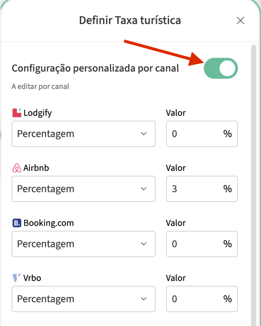 Se pretender definir um valor diferente para uma plataforma específica, pode clicar no ícone do lápis e ativar a opção Configuração personalizada por canal. Caso não pretenda aplicar esta taxa a um canal específico, defina o valor como 0 para esse canal.