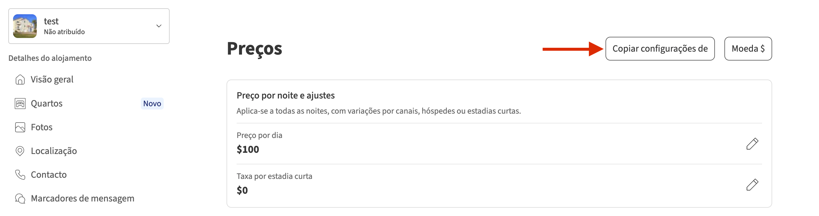 Se tiver mais de um alojamento ou tipo de alojamento e quiser aplicar as mesmas configurações de reserva a todos, pode usar a funcionalidade de Copiar configurações. Esta funcionalidade permite importar preço, taxas e impostos de outro alojamento, economizando muito tempo durante a configuração.