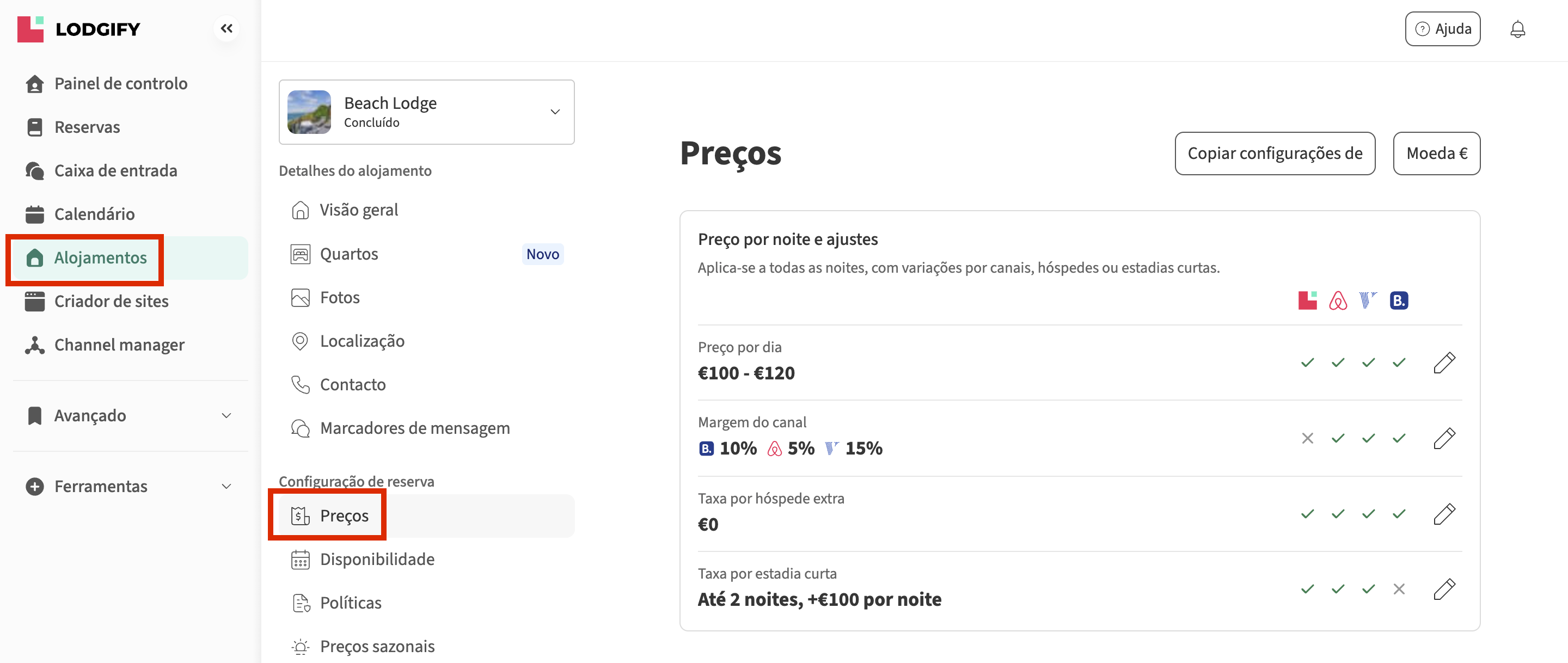 - Vá à secção Alojamentos e clique em Preços.