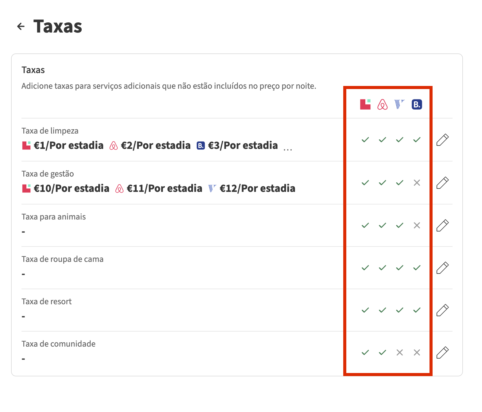 Se estiver ligado ao Booking.com, Airbnb, Expedia ou HomeAway/VRBO através do Channel Manager, os impostos e taxas são exportados de forma específica. Nas secções seguintes, irá aprender como verificar se uma taxa ou imposto está sincronizado com uma OTA, como os impostos são calculados e como taxas e impostos são apresentados nas reservas das OTA.