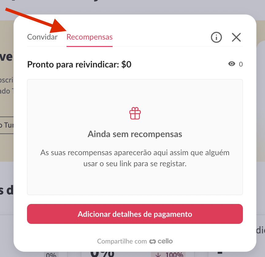 Clique em Recompensas para adicionar os seus dados do PayPal e receber o pagamento.