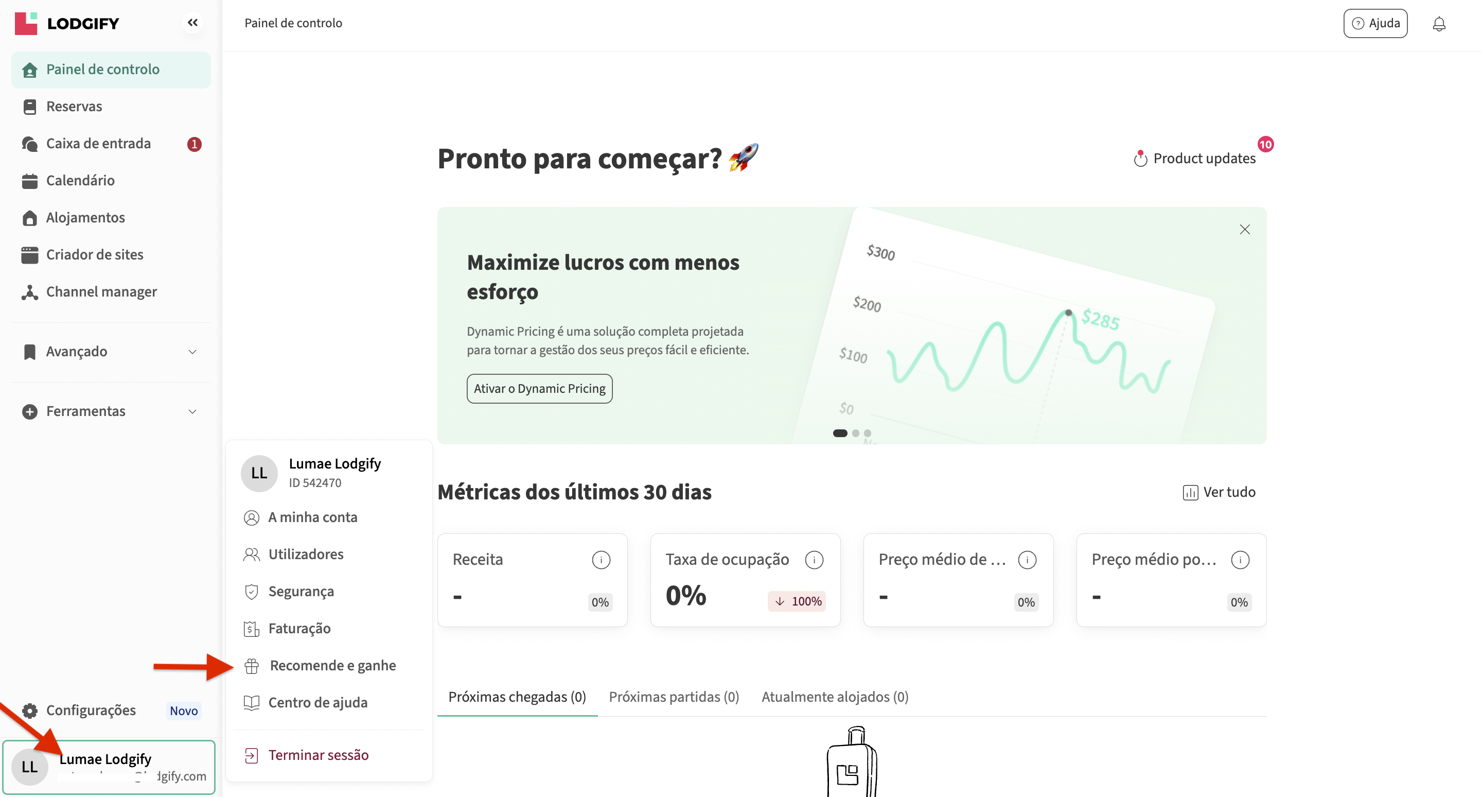 Nesta secção, também pode ver o estado das recompensas das suas recomendações Lodgify.