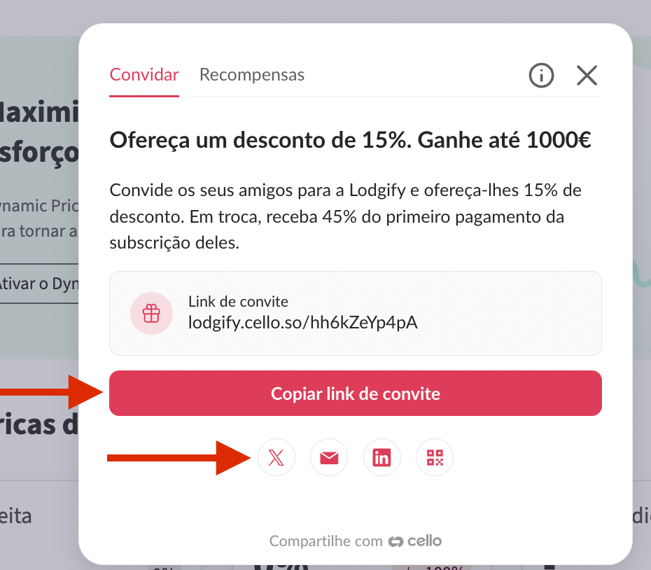 Como cliente Lodgify, pode convidar facilmente amigos a utilizarem a Lodgify ao partilhar o seu link de recomendação pessoal, seja nas redes sociais, por mensagem ou por e-mail.
