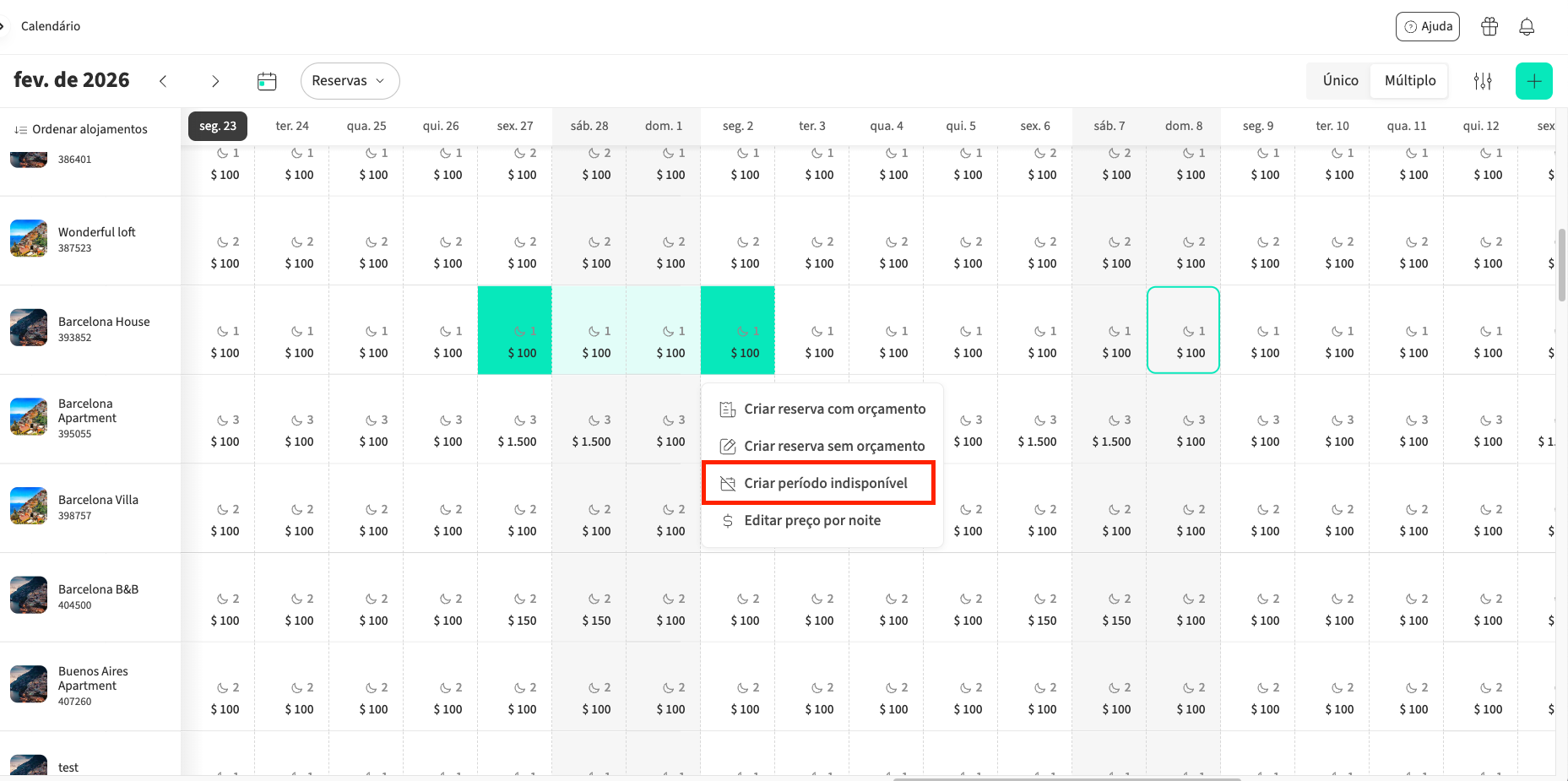Se pretender que um alojamento fique indisponível para reservas durante um determinado período, pode criar manualmente um período fechado no seu Calendário para bloquear a Disponibilidade. Os períodos fechados manualmente podem sempre ser eliminados para voltar a abrir o seu Calendário a reservas. Esta informação será enviada para as OTAs conectadas.