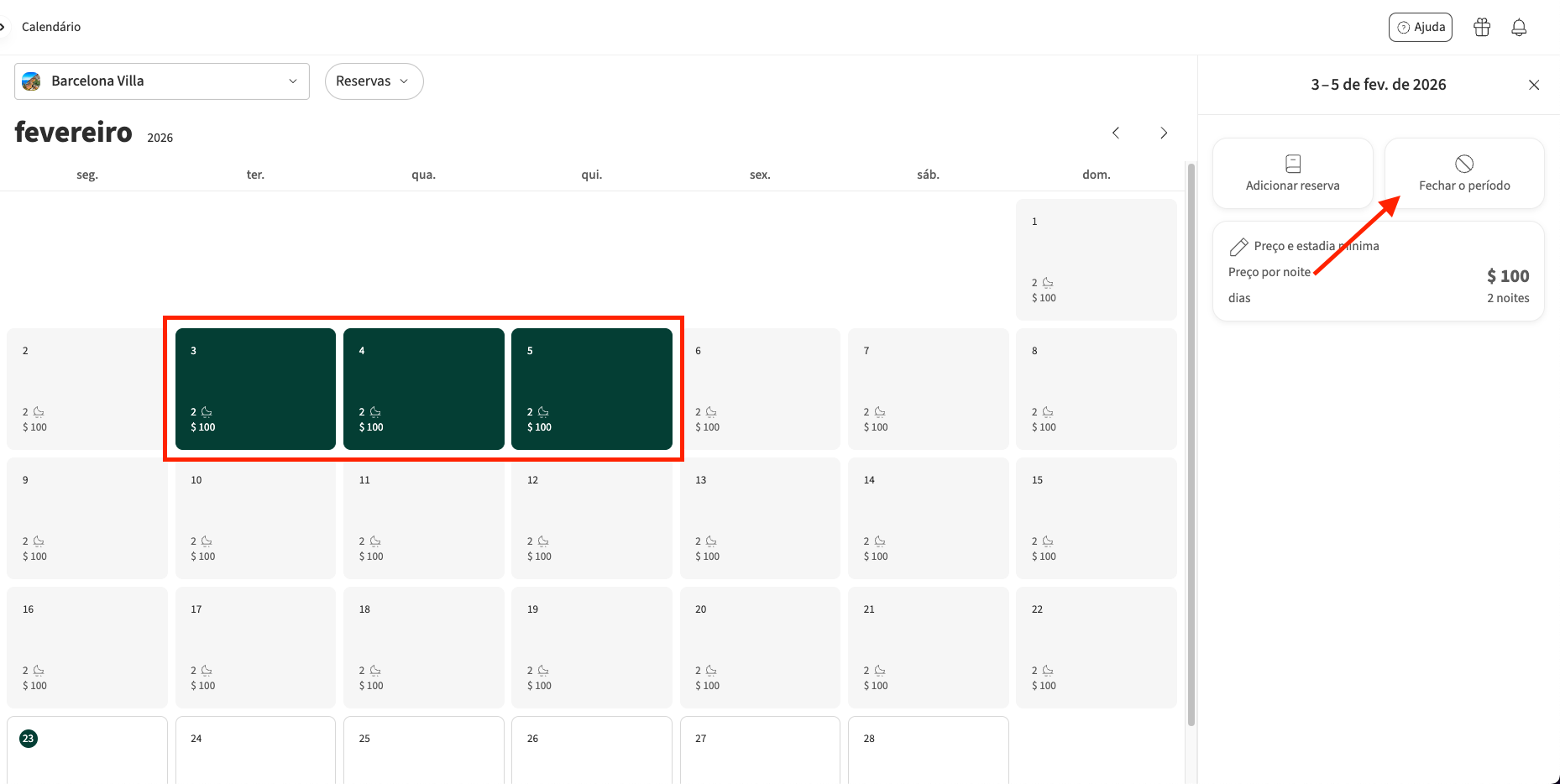 - Após selecionar o alojamento, clique na data ou no intervalo de datas que pretende fechar. No lado direito, selecione Fechar o período.