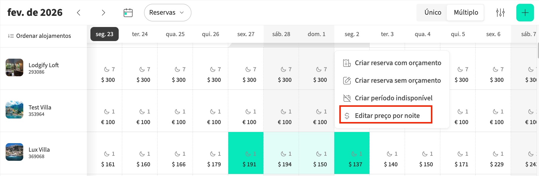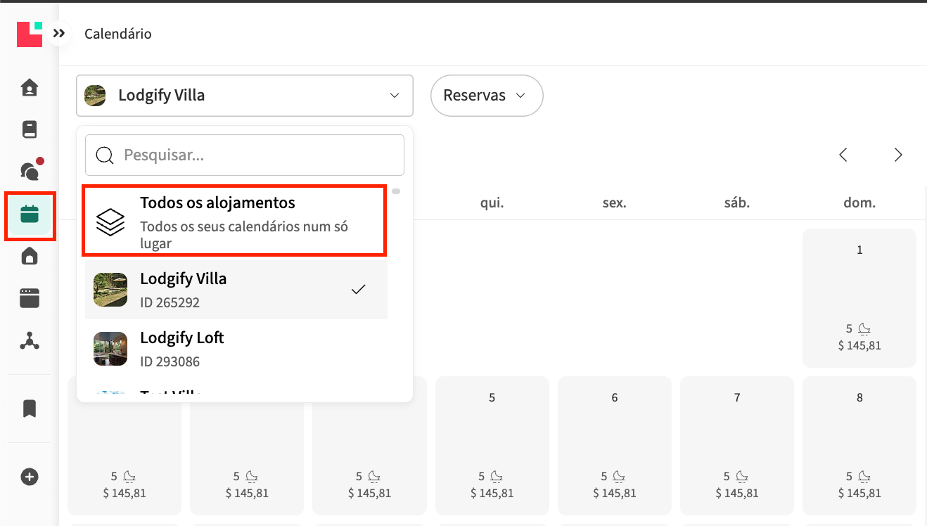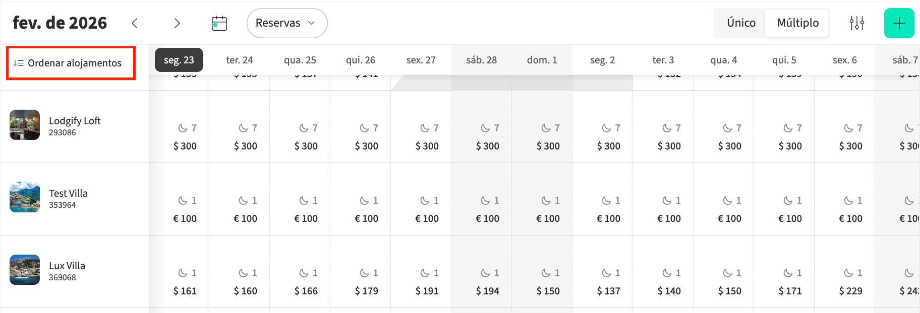| Ordenar alojamentos | Várias Unidades | No canto superior esquerdo do calendário, pode ordenar e escolher quais os alojamentos que pretende ver. Ao selecionar Personalizar lista de alojamentos, pode ocultar alojamentos ou reorganizar a ordem em que aparecem. Esta informação fica guardada no seu navegador, pelo que, se utilizar um dispositivo diferente, as suas preferências de ordenação não estarão visíveis. |