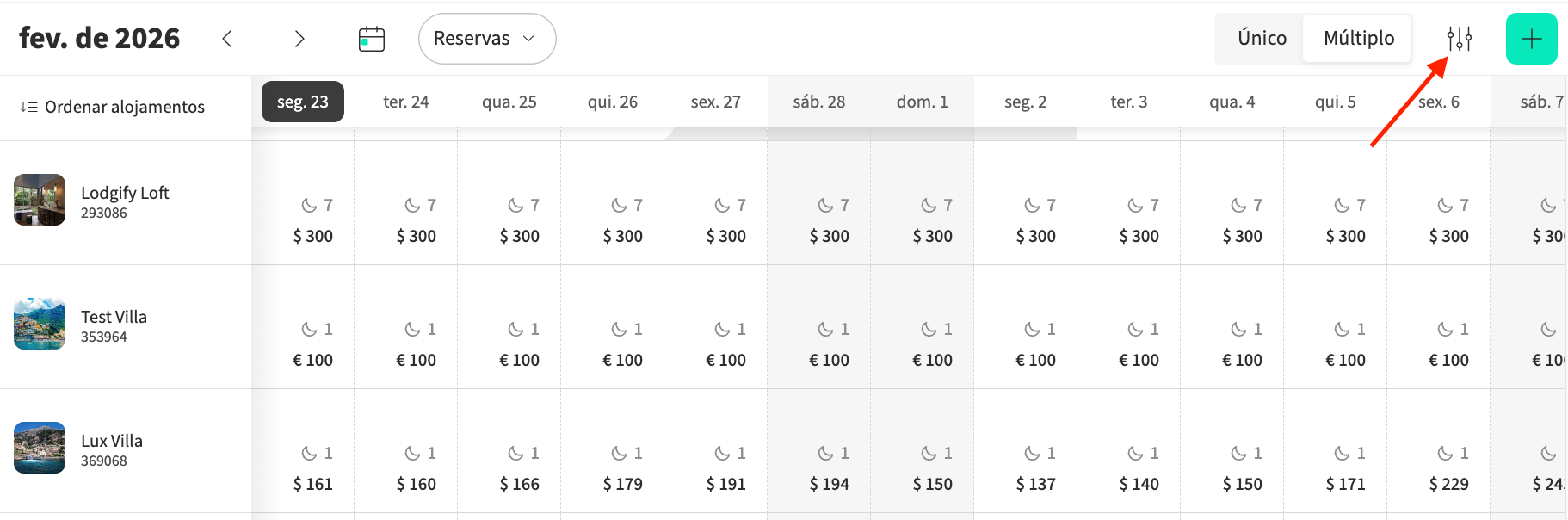 - Filtrar por: Filtrar a vista por reservas ou alojamentos específicos,