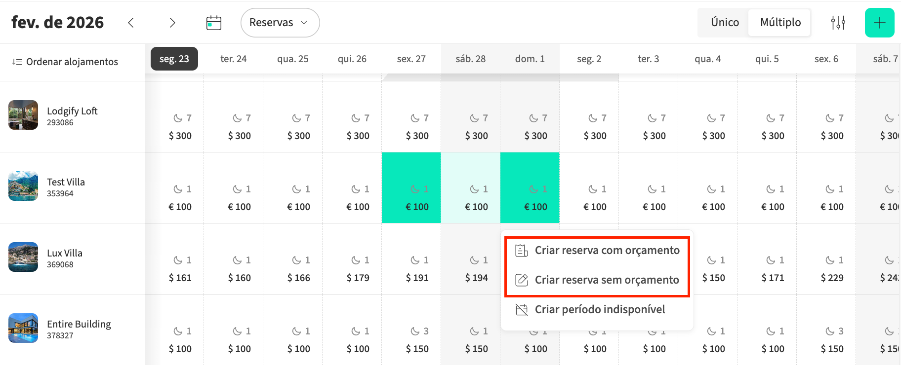 | Criar uma reserva ou um período fechado | Unidade Única + Várias Unidades |