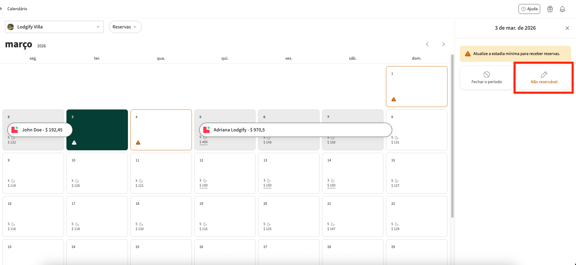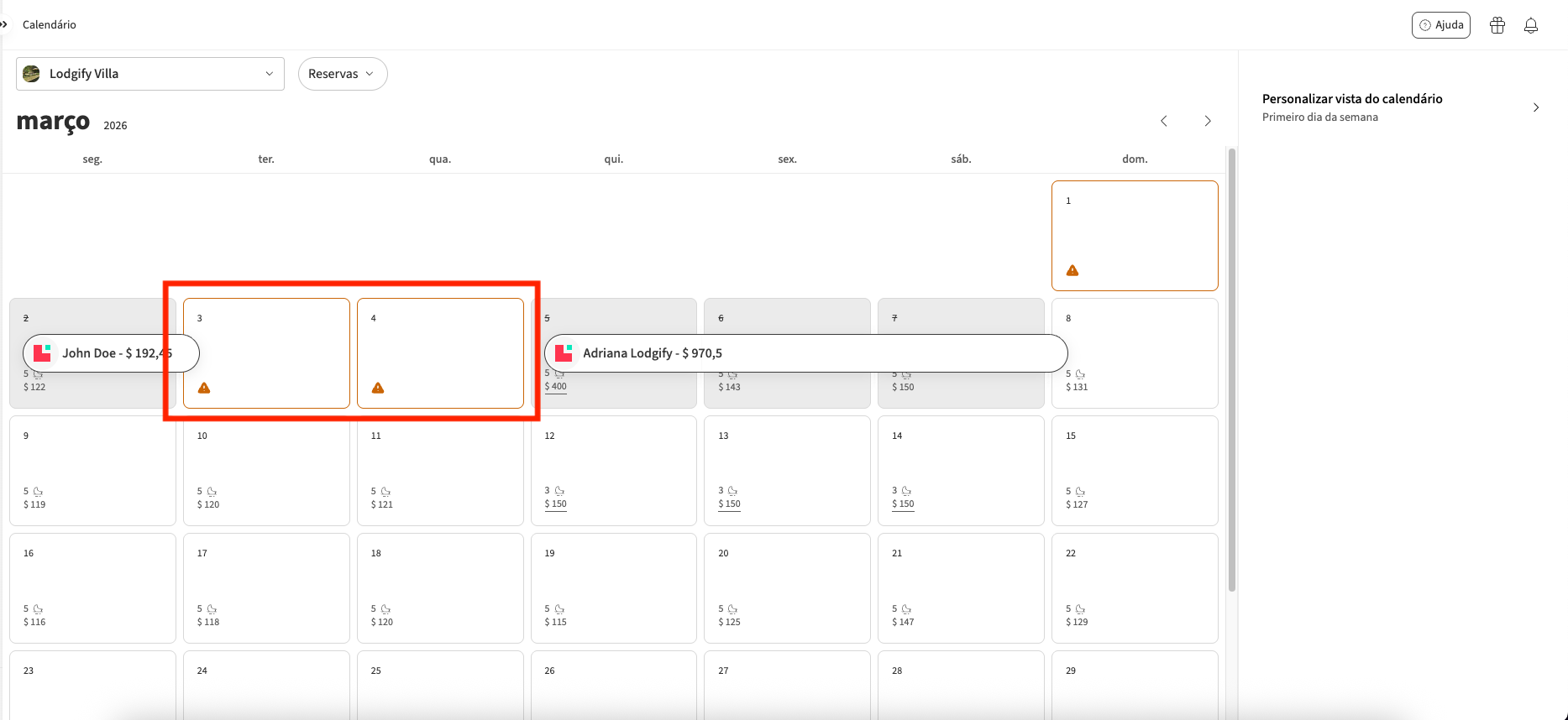 Receba um alerta quando o sistema detetar intervalos não reserváveis no seu calendário causados por restrições de estadia mínima. Por exemplo, se existirem duas noites disponíveis entre reservas, mas a sua estadia mínima estiver definida para mais de duas noites, será apresentado um ícone de aviso nessas datas. |