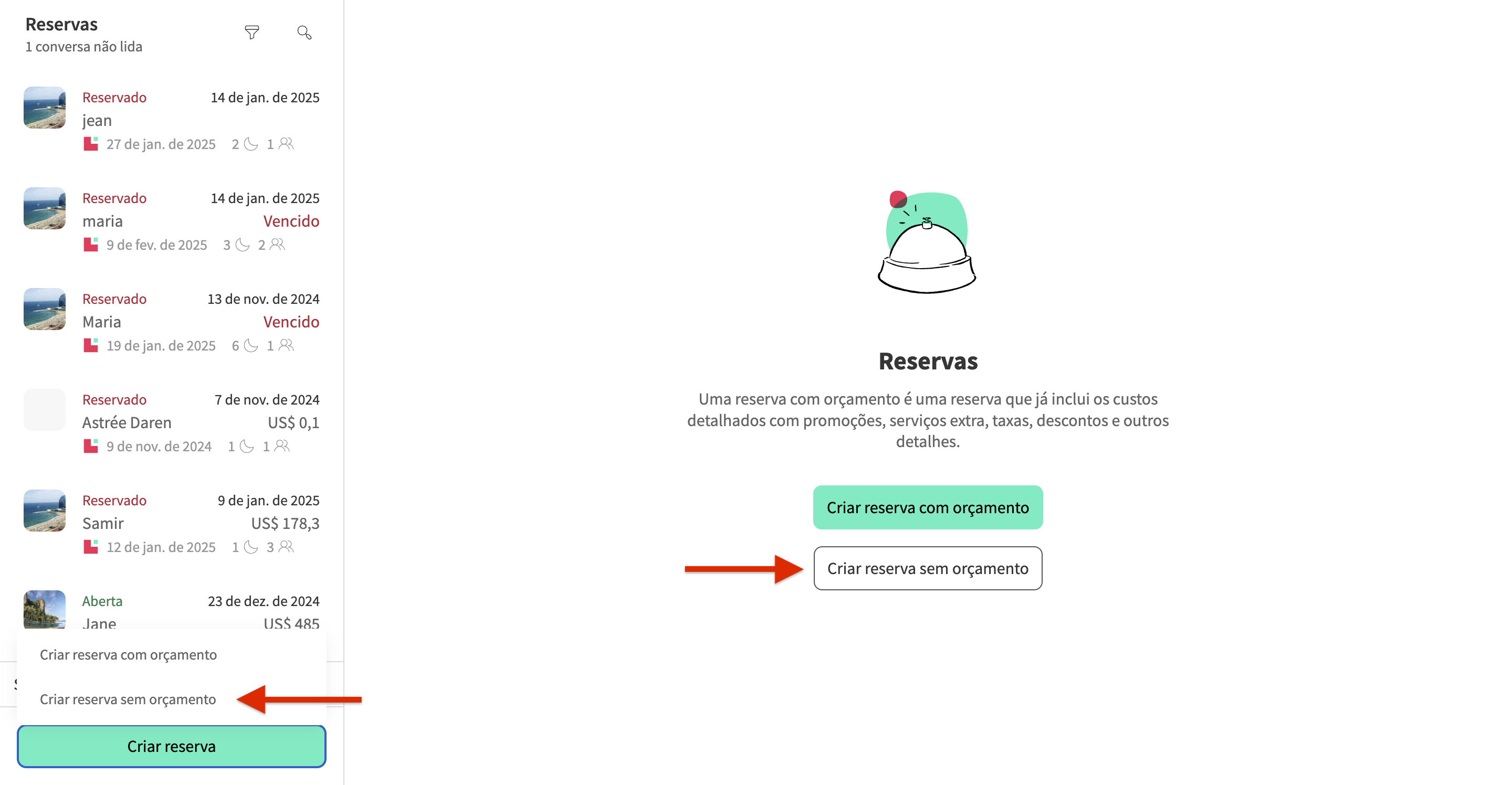 Se pretender adicionar uma reserva com preço, veja como criar uma reserva com orçamento.