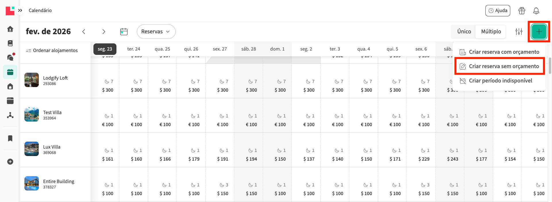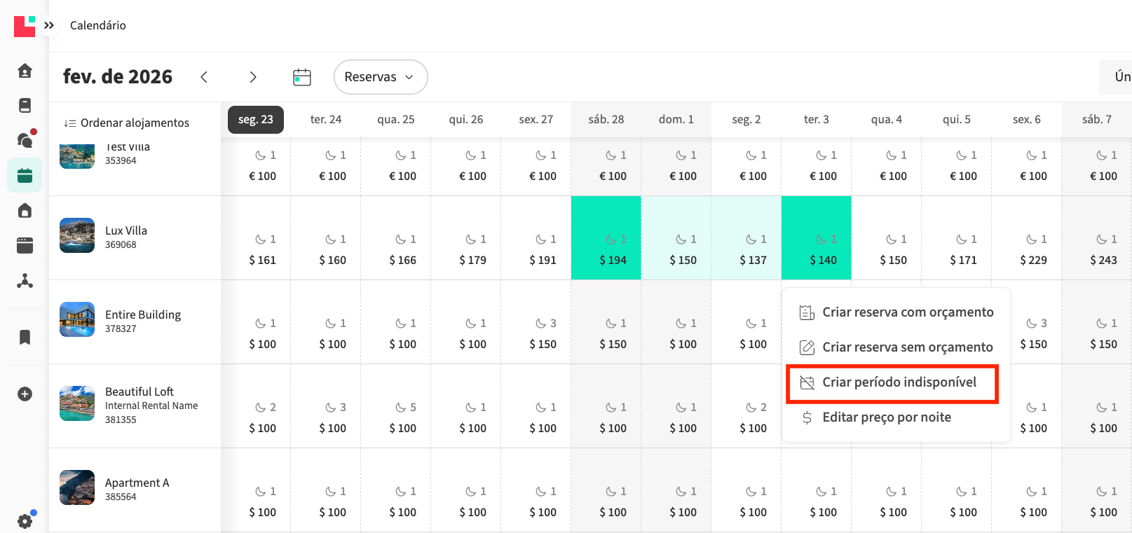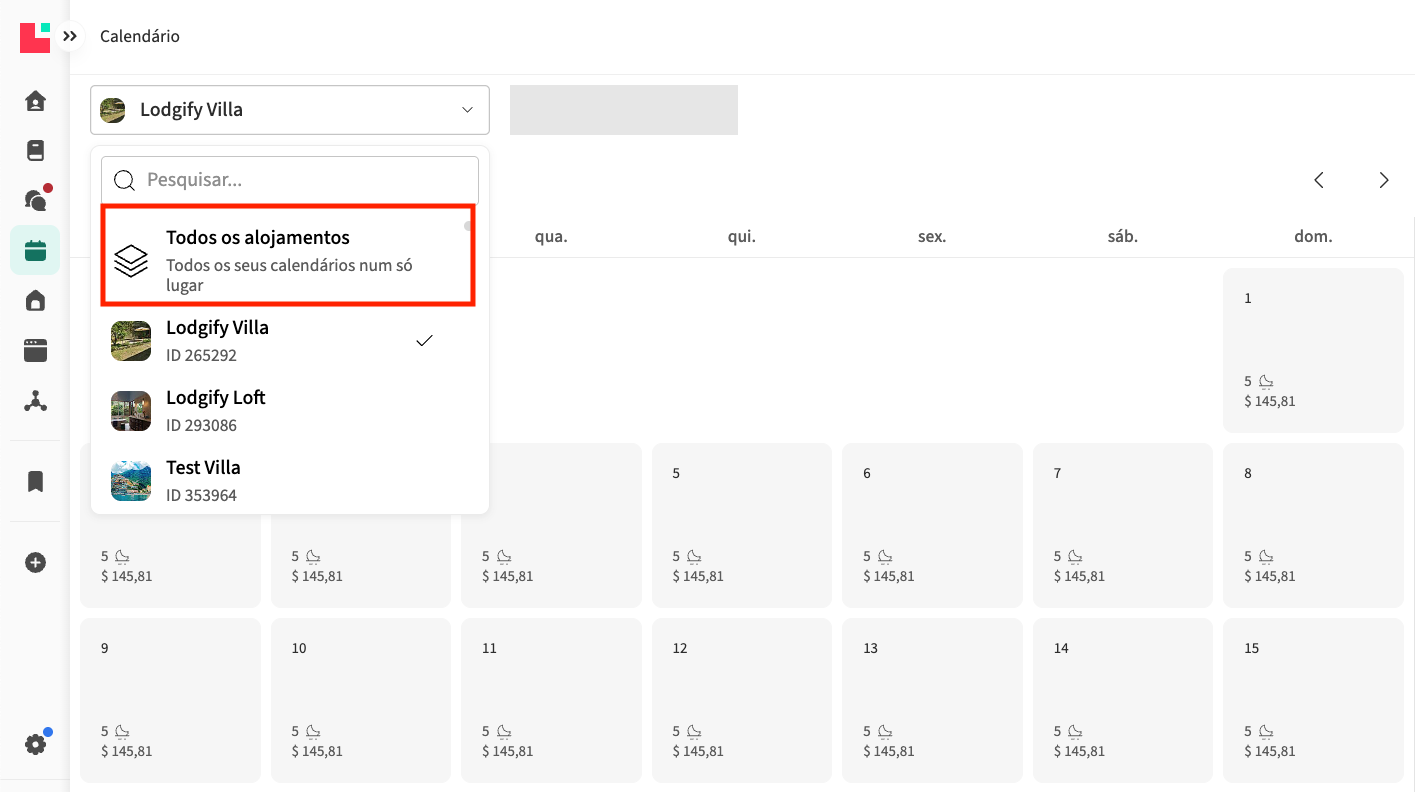 - Vá ao menu principal no lado esquerdo e selecione Calendário. Aceda ao Calendário de todos os alojamentos (vista de várias unidades):