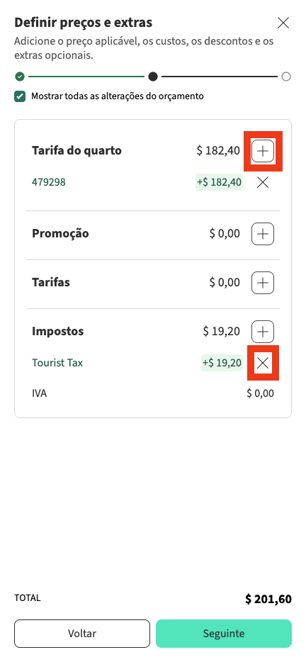 💡 Nota: Na aplicação móvel também pode definir um número de hóspedes padrão. - Na página seguinte, reveja os detalhes do preço e os serviços extras. Pode usar os ícones de mais ou da cruz se precisar de modificar algo e, de seguida, clique em Seguinte.