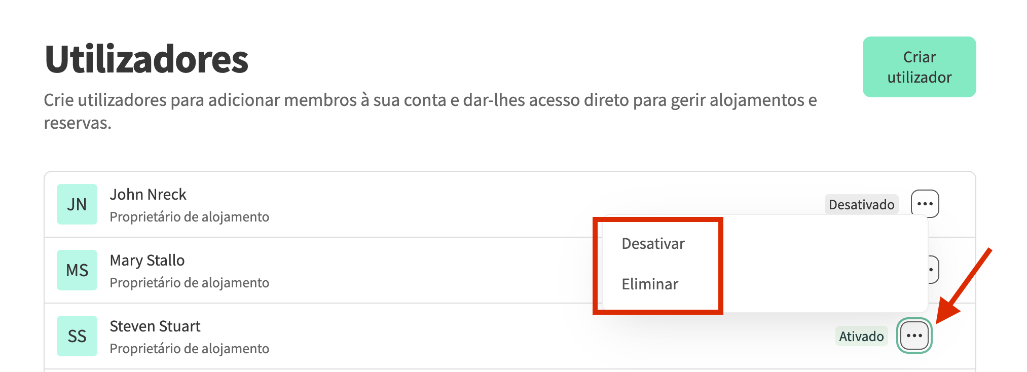 - Na lista de utilizadores, clique no ícone dos três pontos junto a Pendente / Ativado e selecione Eliminar ou Desativar no menu suspenso.