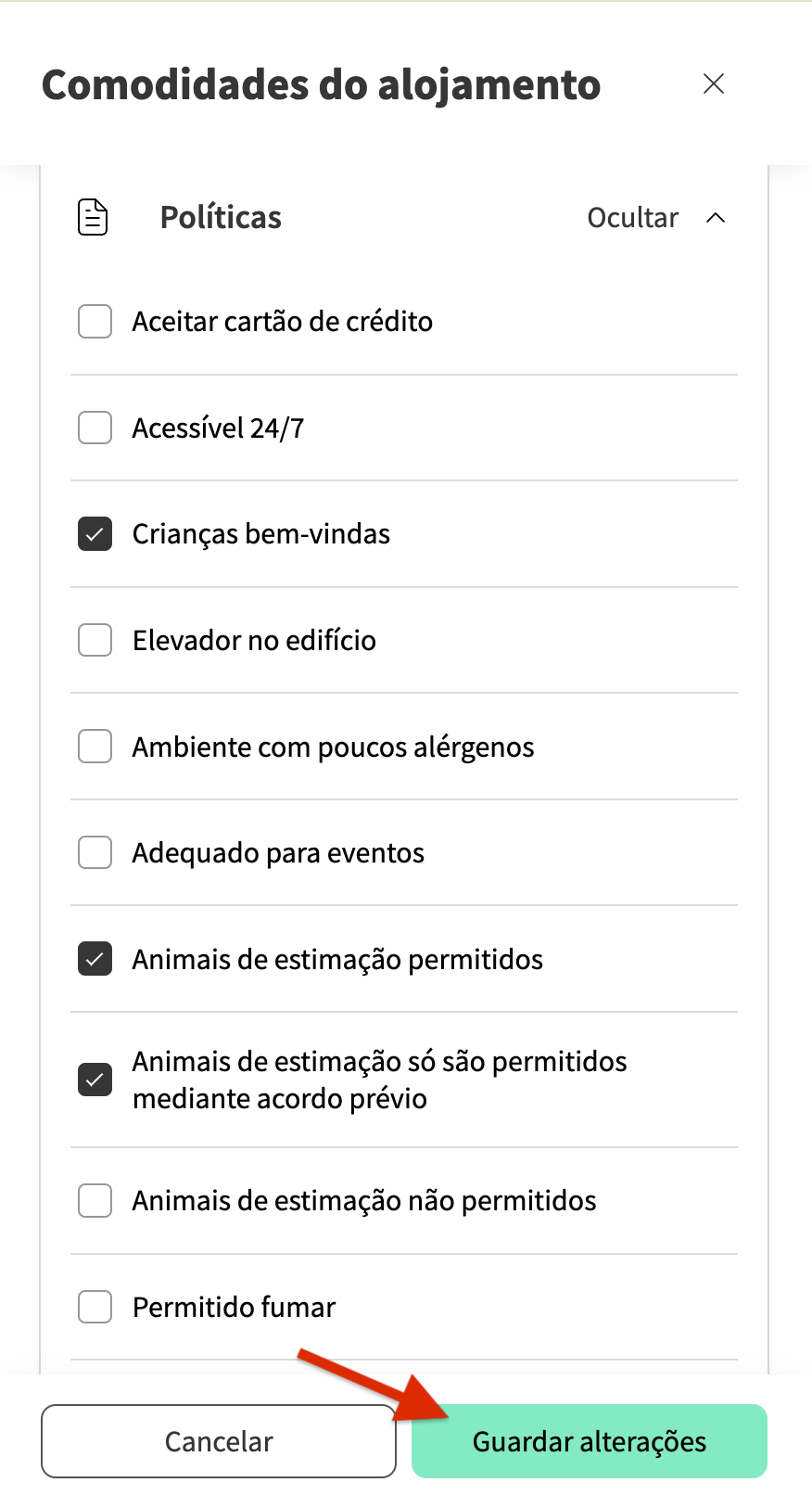 Para gerir esta permissão, clique nas comodidades relacionadas no seu alojamento: