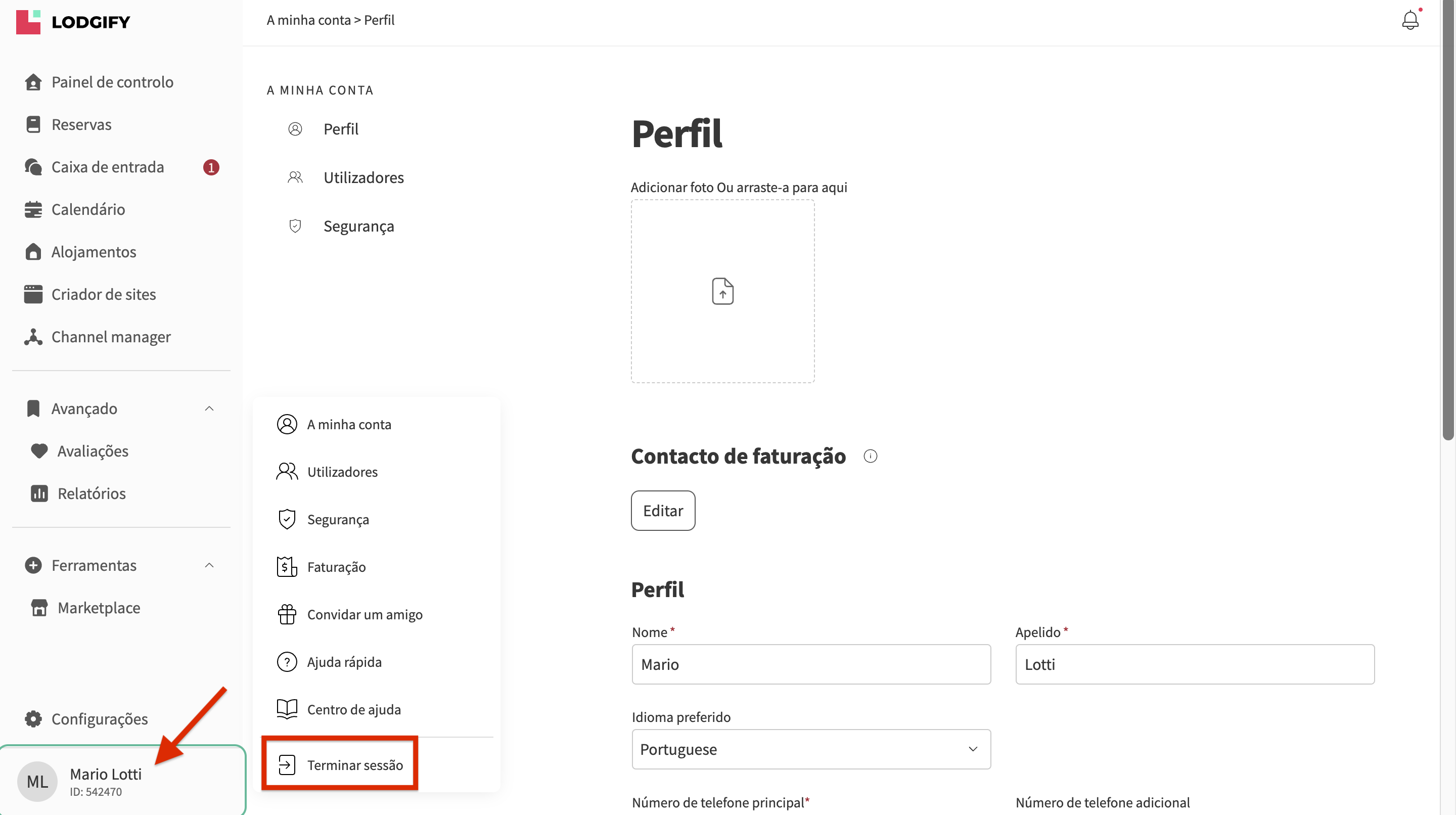 - Depois volte ao menu da conta e selecione Terminar sessão.