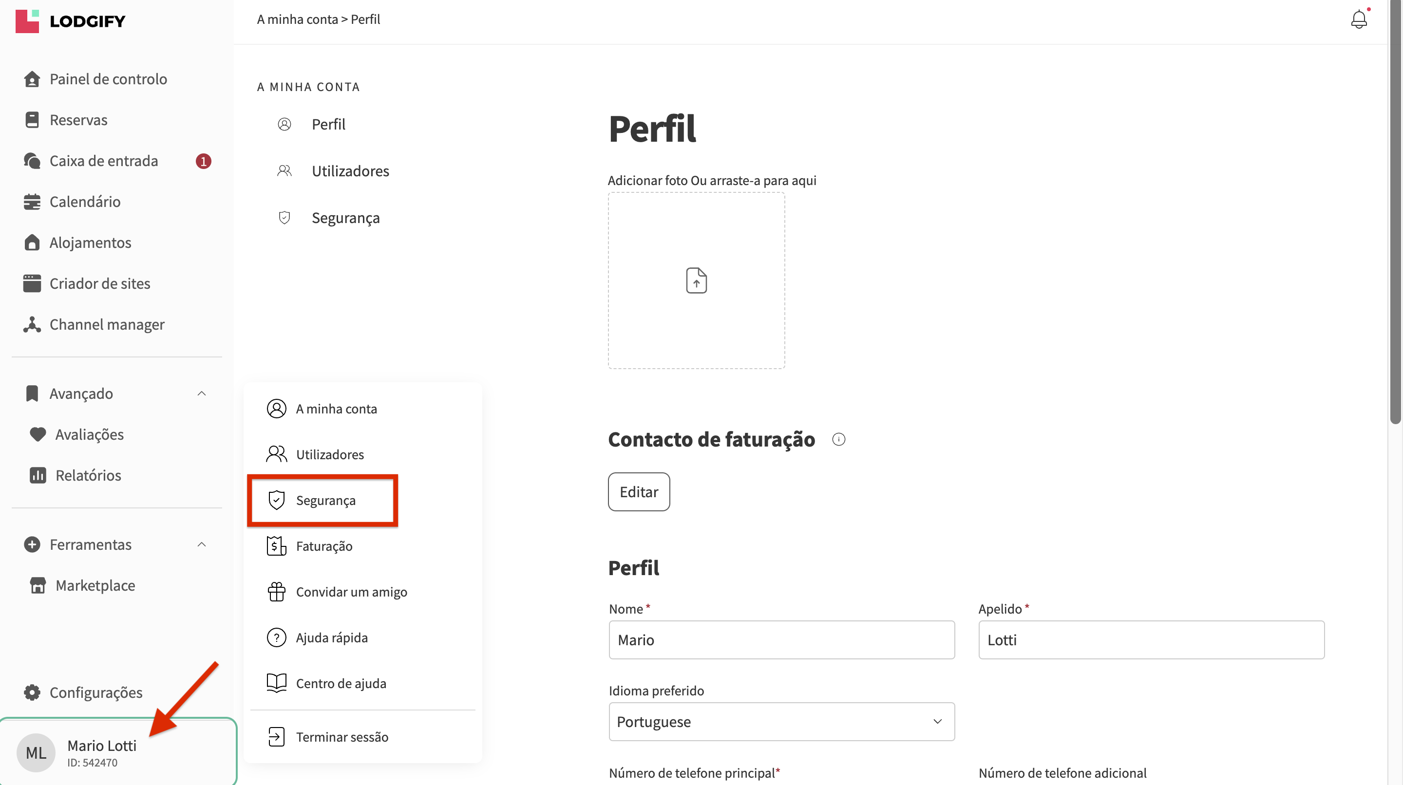- Inicie sessão na sua conta Lodgify e vá ao Menu Conta no canto inferior esquerdo. Em seguida, selecione Segurança.