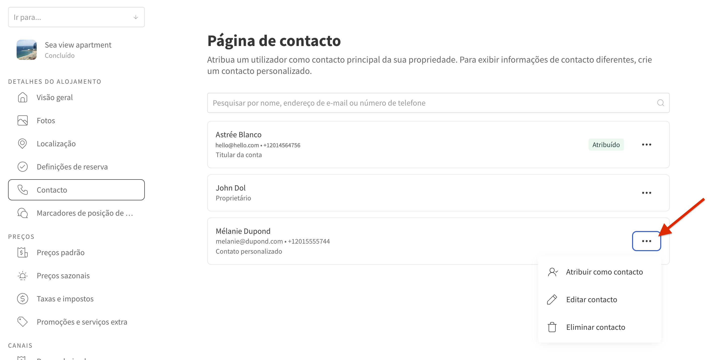 - Depois de criar o contacto, para atribuir este novo contacto ao alojamento, clique nos três pontos e selecione Atribuir como contacto. Também pode optar por Editar ou Eliminar este contacto.