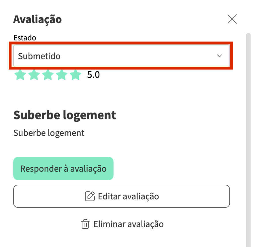 - Verá a nova avaliação com o status Submetido. Clique nela, e um novo slider irá abrir onde pode aceitar, rejeitar ou editar a avaliação, bem como responder ao hóspede. Saiba mais detalhes sobre cada ação na tabela abaixo.