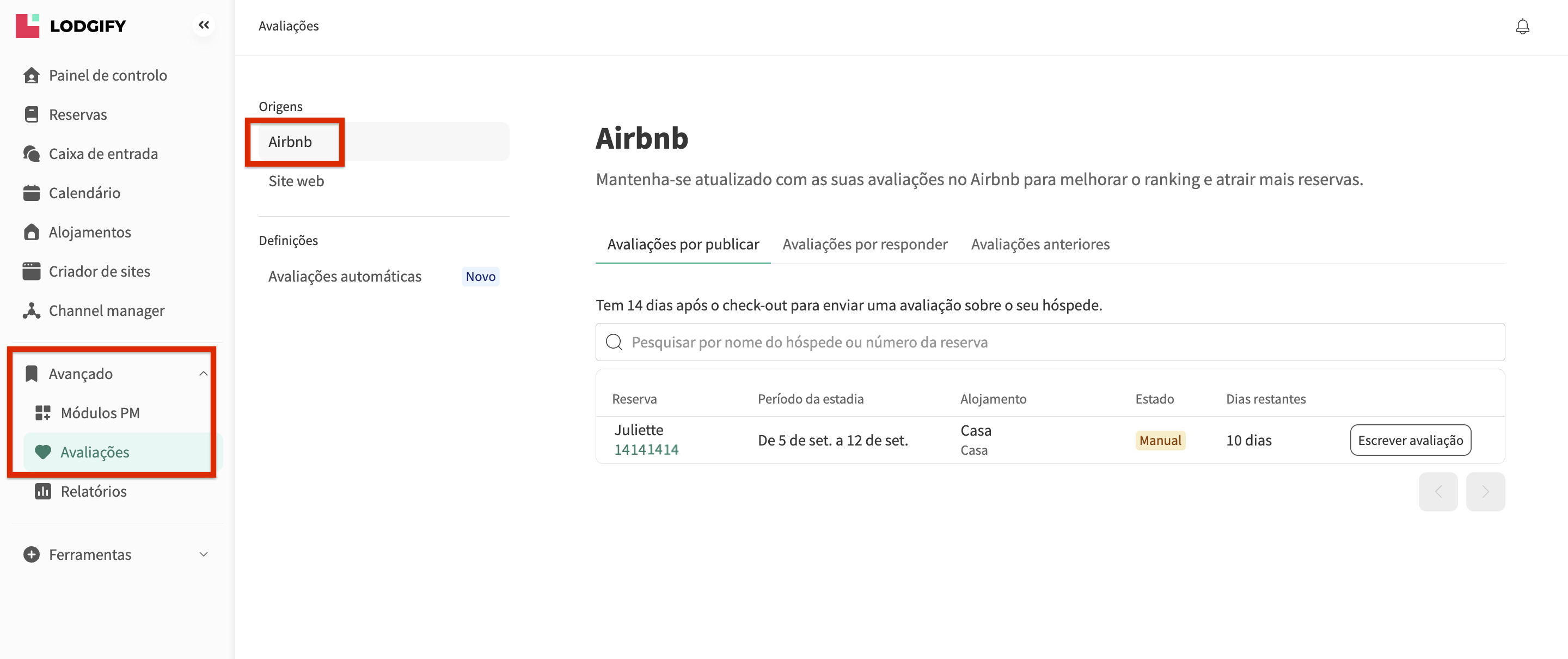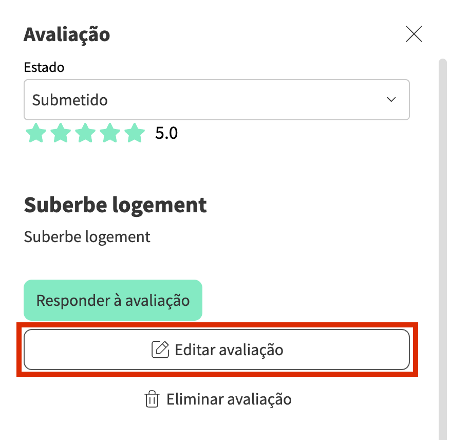 As alterações feitas às avaliações no Lodgify serão refletidas na sua conta Airbnb e nas páginas públicas do Airbnb (uma vez aprovadas pelo Airbnb, no caso de ser uma avaliação escrita por si).