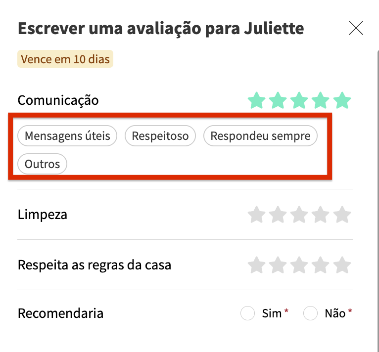 Ao escrever avaliações, tanto você quanto os seus hóspedes podem usar tags específicos para destacar aspetos positivos ou negativos da estadia, como a limpeza, a comunicação ou o respeito pelas regras da casa. Estas tags ajudam-no a identificar áreas que possam necessitar de melhorias ou áreas em que está a sobressair, levando a melhores experiências para os hóspedes, avaliações melhoradas e potencialmente a maiores taxas de reserva. Tanto os anfitriões como os hóspedes podem ver as tags associadas às avaliações no Airbnb.