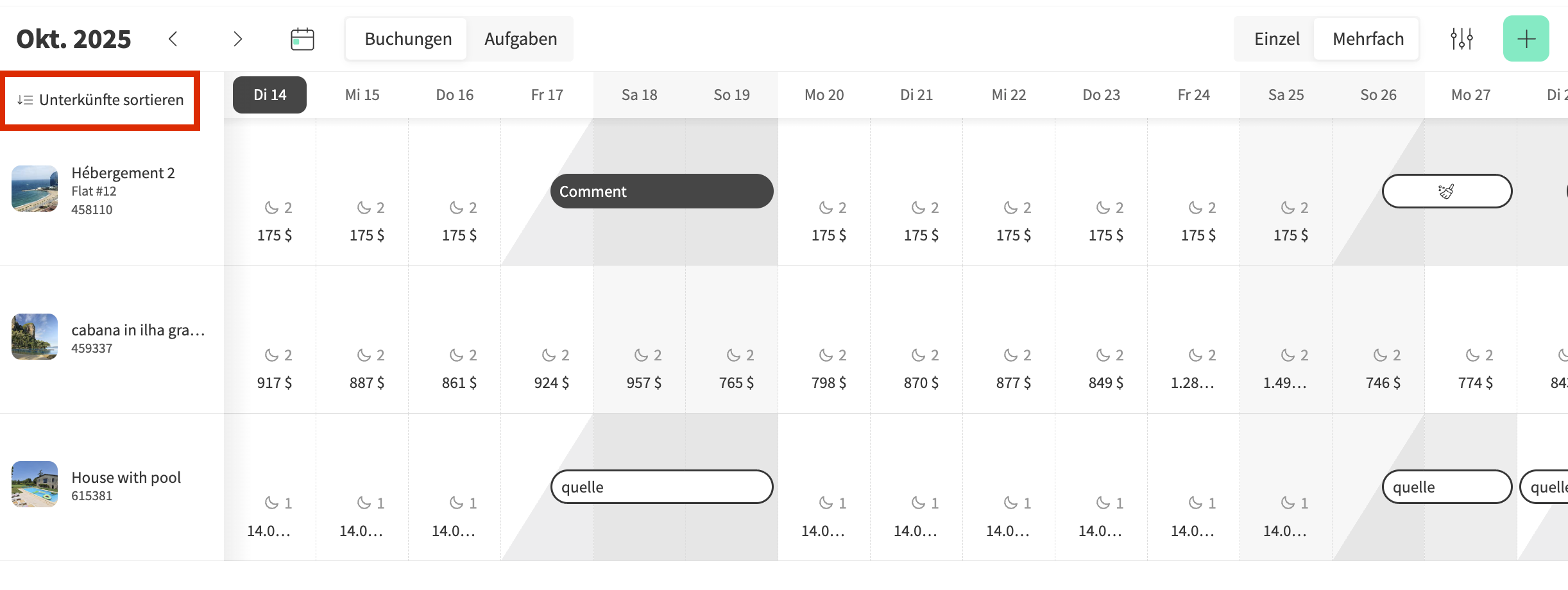 | Unterkünfte sortieren | Mehrfach | Oben links im Kalender können Sie auswählen und sortieren, welche Unterkünfte Sie anzeigen möchten. Wenn Sie Liste der Unterkünfte anpassen wählen, können Sie Unterkünfte ausblenden oder die Reihenfolge ändern, in der sie angezeigt werden. Diese Informationen werden in Ihrem Browser gespeichert, daher sind Ihre Sortierungseinstellungen auf einem anderen Gerät nicht sichtbar. |