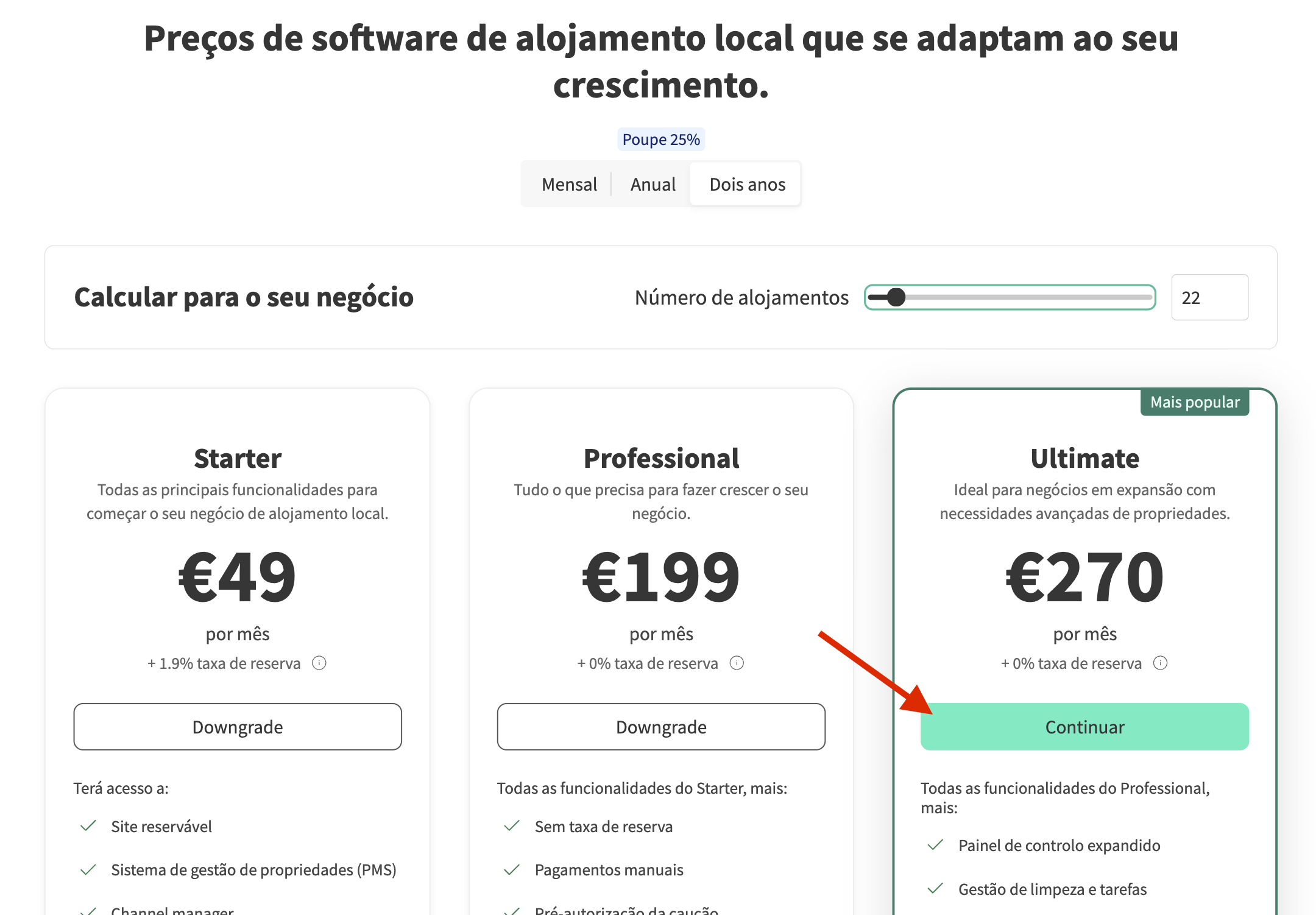 - O sistema irá mostrar-lhe o plano de preços, e poderá escolher um plano diferente, adicionar alojamentos ou alterar o período de faturação: