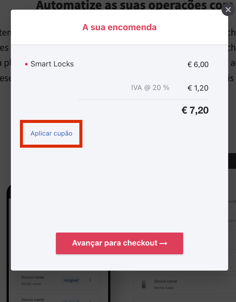 Ao rever o seu pedido, verá a opção para Aplicar cupão e depois Avançar para Checkout: