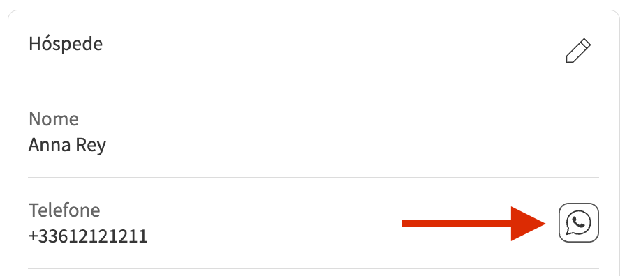 💡 Nota: Todas as notificações automáticas por e-mail serão enviadas no idioma selecionado. Se não tiver este idioma configurado nos seus e-mails, eles serão enviados por padrão em inglês. Saiba como gerir os seus e-mails automáticos. - O número de telefone preferido do hóspede. Poderá contactar o seu hóspede via WhatsApp, se disponível.