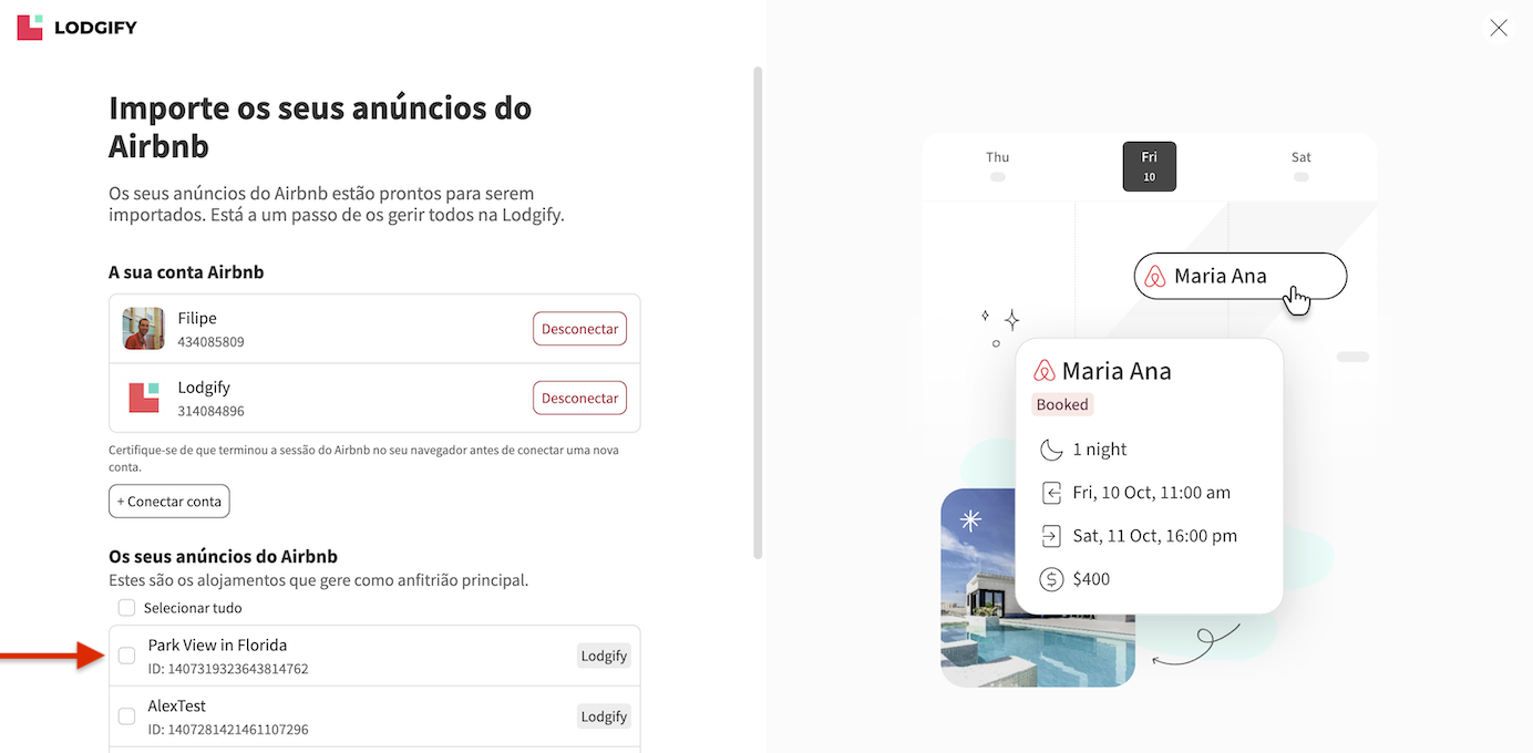 5. Agora pode voltar à janela do Lodgify, onde os seus anúncios da Airbnb irão aparecer. Selecione os alojamentos que pretende importar.