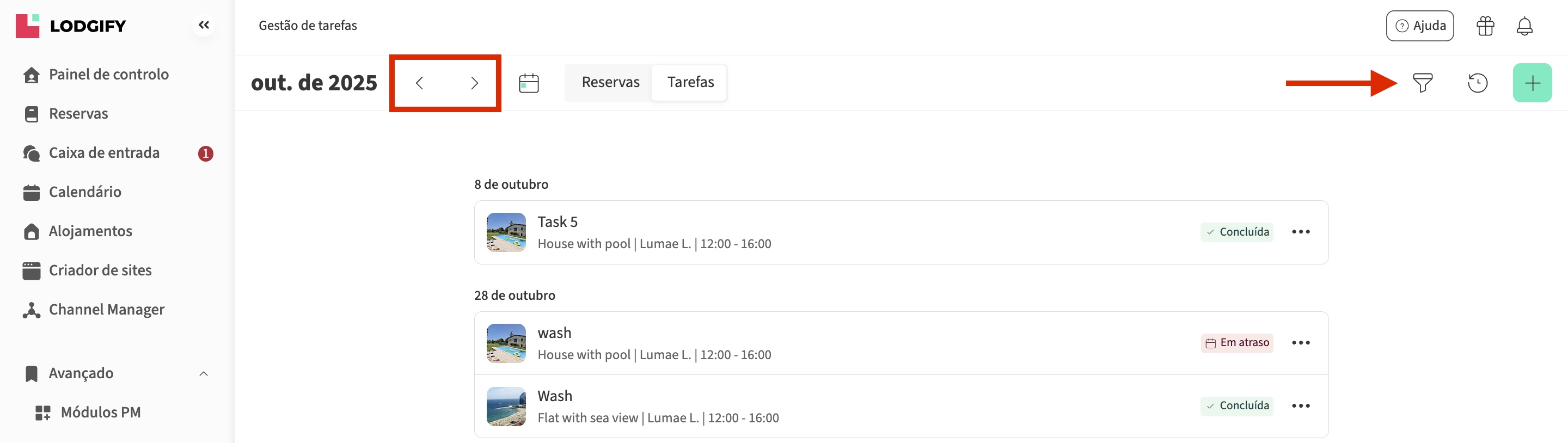 As suas tarefas estão ordenadas cronologicamente por mês. Pode mudar de mês usando as setas no canto superior esquerdo para ver as tarefas de meses diferentes do atual. Também pode filtrar as suas tarefas clicando no ícone de filtro no canto superior direito.