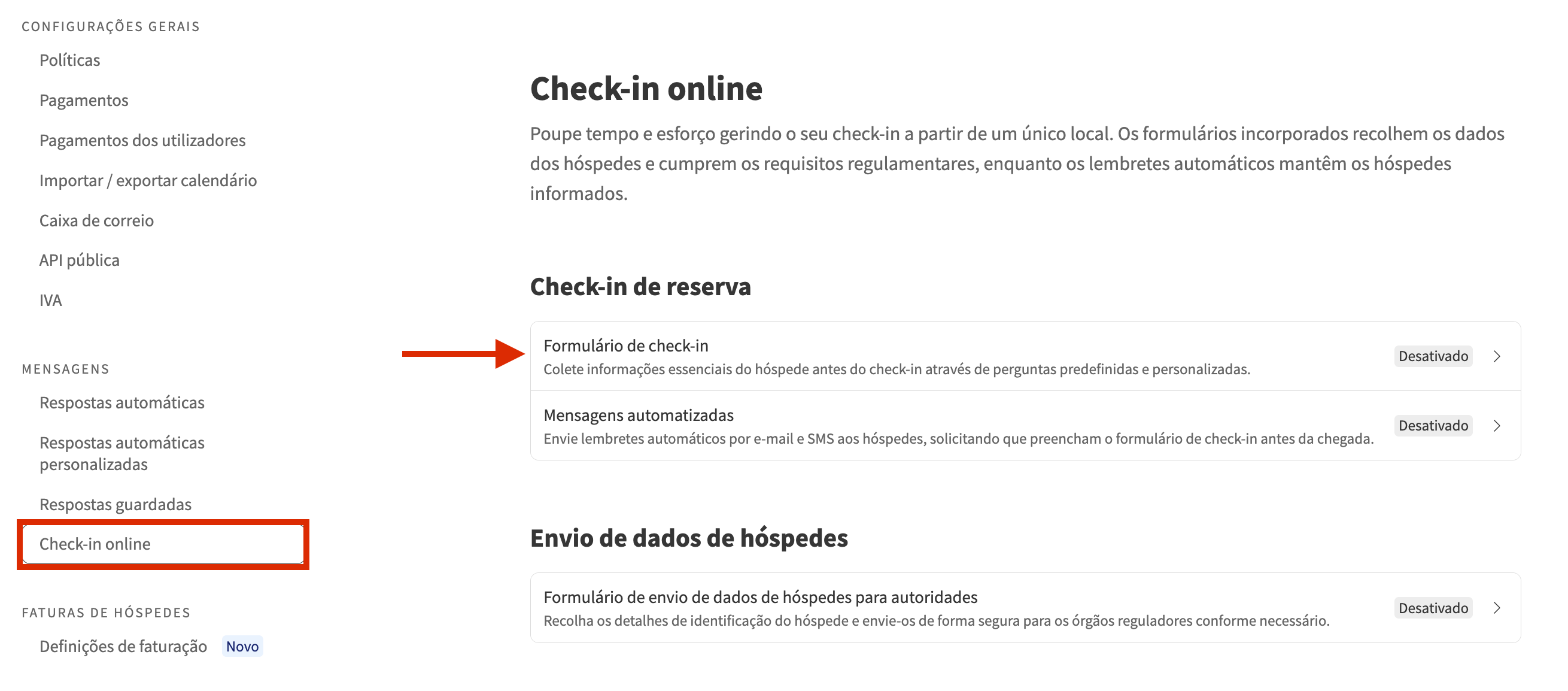 Tem a opção de selecionar a caixa de verificação para ativar o envio automático do formulário de check-in quando um hóspede faz uma reserva no dia do check-in. Aplica-se a reservas com o estado Reservado.