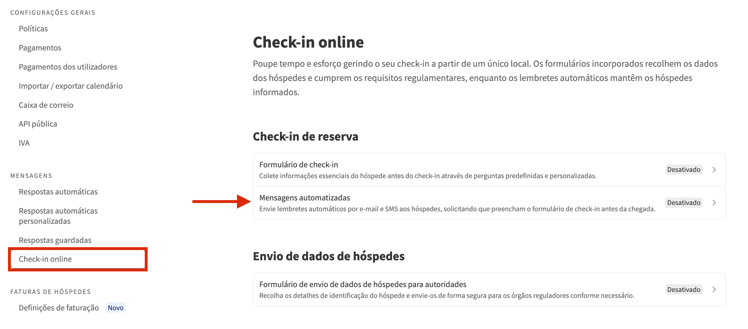 É possível ativar os e-mails e SMS de check-in de reserva para recolher as informações pessoais dos seus hóspedes antes do check-in e fornecer detalhes adicionais. Automatizar o envio de lembretes do formulário de check-in aumenta a probabilidade de receber os formulários preenchidos e simplifica o processo de check-in, tornando-o mais rápido e fácil.