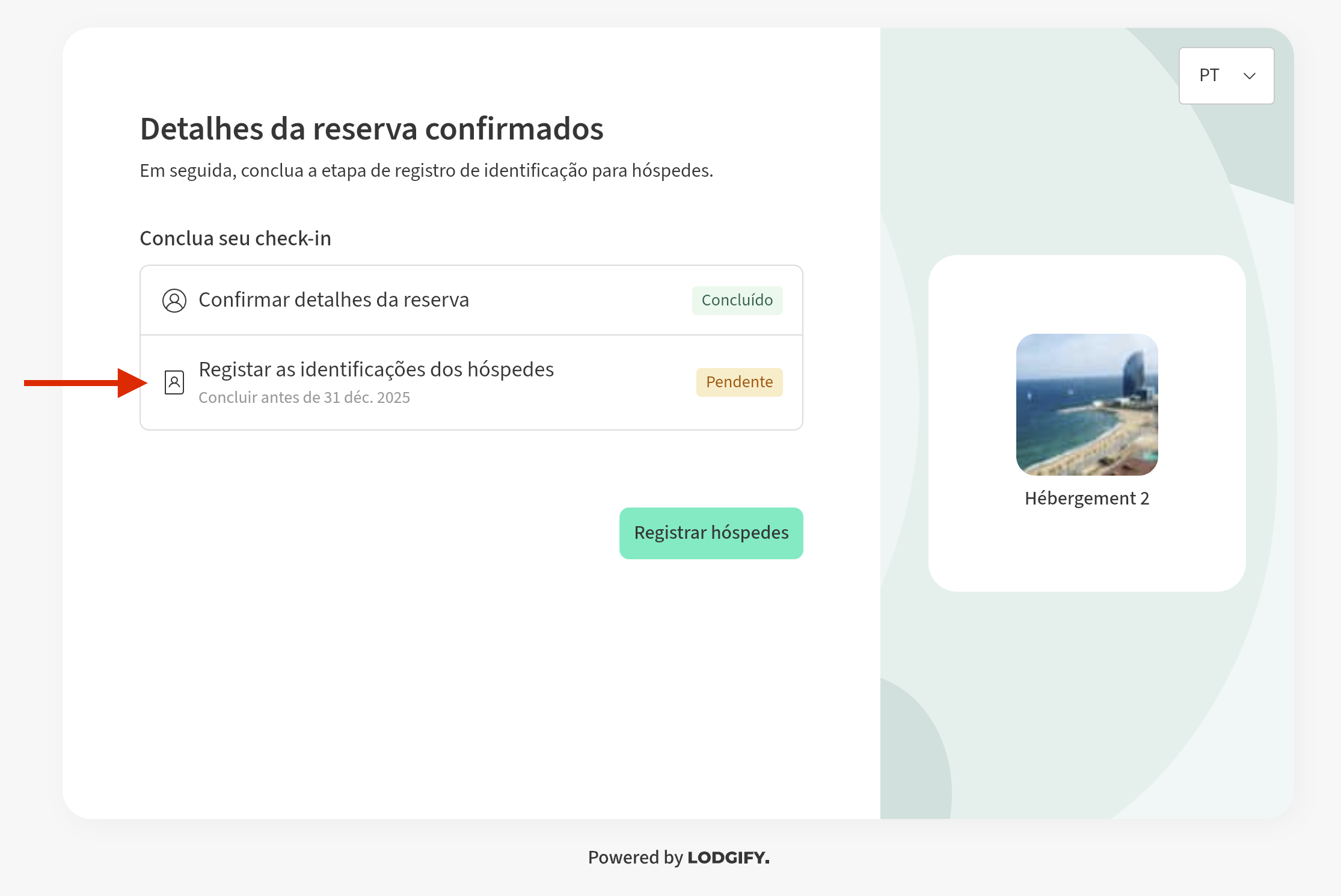 - Depois de completar a informação no formulário de check-in de reserva, se o formulário de envio de dados de hóspedes estiver ativado, o hóspede será automaticamente convidado a preenchê-lo: