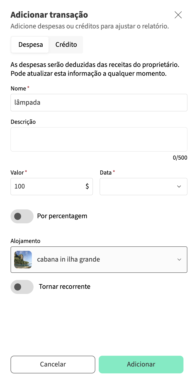 - A transação aparecerá automaticamente nos próximos relatórios de proprietário que incluírem a data da transação.