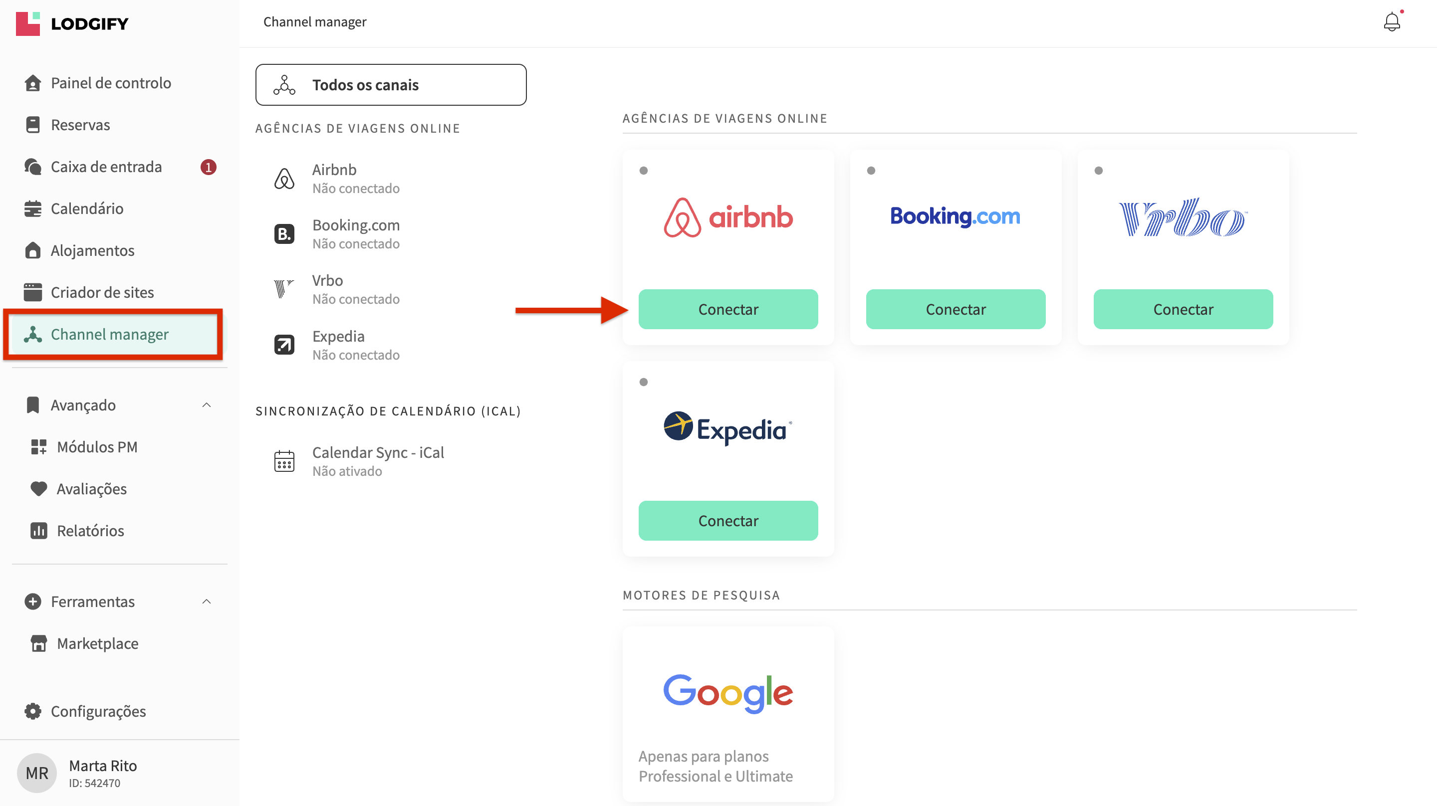 - Aceda ao menu do lado esquerdo, selecione Channel Manager e escolha Airbnb.